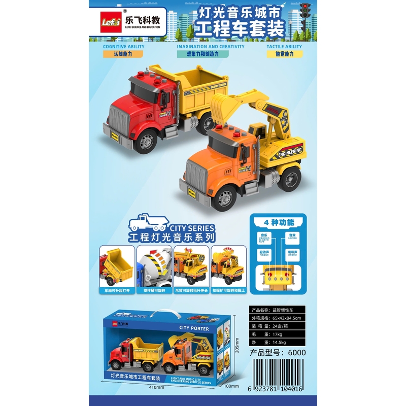 - Gồm 2 xe công trình (xe xúc + xe ben), thiết kế mô phỏng sống động.